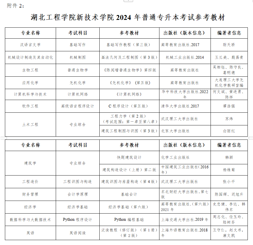 (5)各专业课考试大纲将在专升本工作网站上公布,各专业课考试参考教材参见附件2。