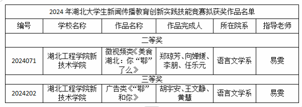 本网讯 8月29日,2024年度湖北省老员工新闻传播教育创新实践技能竞赛结果揭晓,公司语言文学系学子再获佳绩,获得大赛二等奖1项,三等奖1项。其中,由郑琼芳、向婵媛、李朋、任乐元同学共同创作的微视频类作品《美食湖北:你“鄂”了么》荣获二等奖,胡宇安、王文静、黄慧同学共同创作的广告类作品《“鄂”和你》荣获三等奖,两项作品都由易雯老师指导。