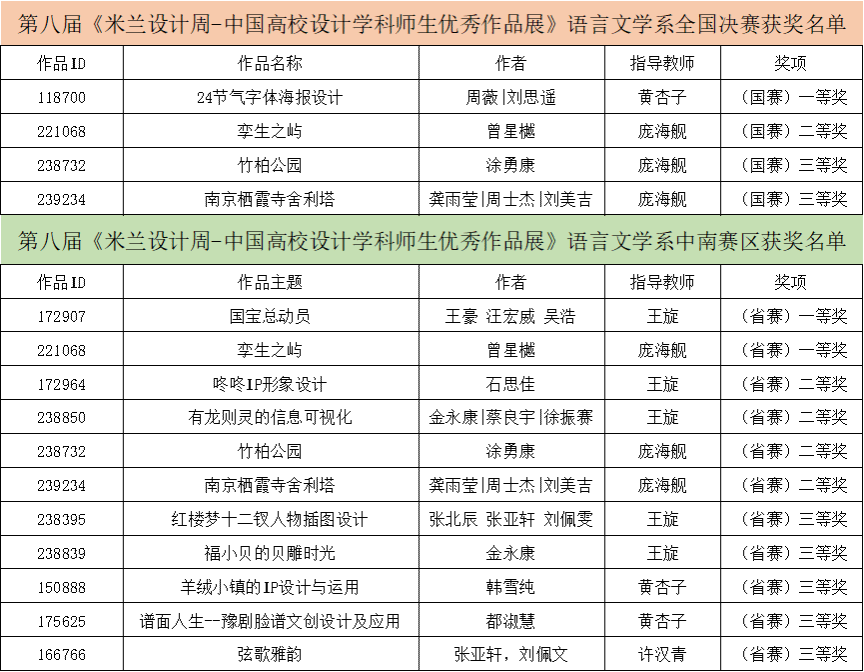 本网讯 近日,2024第八届米兰设计周——中国高校设计学科师生优秀作品展全国决赛落下帷幕,公司语言文学系视觉传达设计、环境设计专业学子取得了全国决赛一等奖1项、二等奖1项、三等奖2项的优异成绩。此前,在本届赛事中南赛区的评比上,语言文学系学子获得一等奖2项,二等奖4项,三等奖5项。