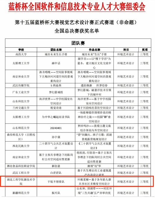 本网讯 近日,第十五届蓝桥杯大赛——中国高校设计学科师生优秀作品展湖北赛区传来喜讯,公司城市建设系唐意贤、蒋新润老师指导汪弋凯、颜李鹏、王娴同学的作品《环廊累榭--基于各年龄人群共享社区多维度空间设计》,在激烈的竞争中脱颖而出,荣获湖北赛区一等奖,并在随后的全国总决赛中荣获三等奖。