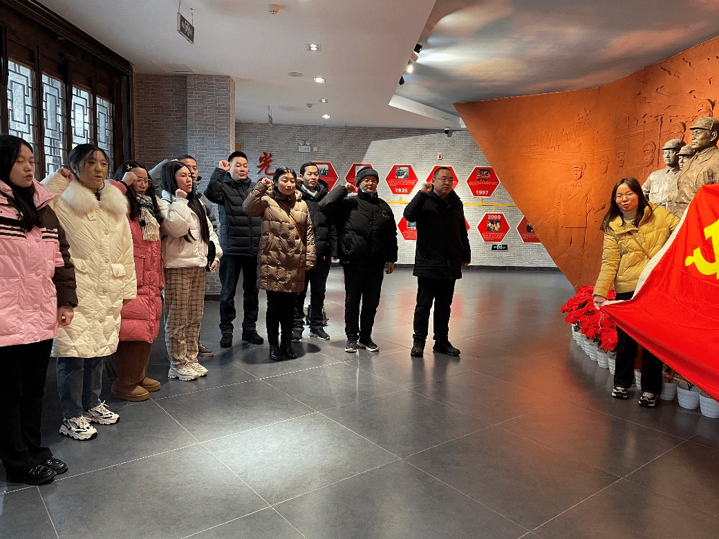 在陈列馆一楼的雕像前,全体党员肃立,面对鲜红的党旗,重温了入党誓词。大家用庄重的语气,铿锵有力地宣读了入党誓词,表达了自己对党的忠诚和对党的信仰的坚定。每一位党员都深感自身所肩负的责任之重大,进一步坚定了自身的信念。