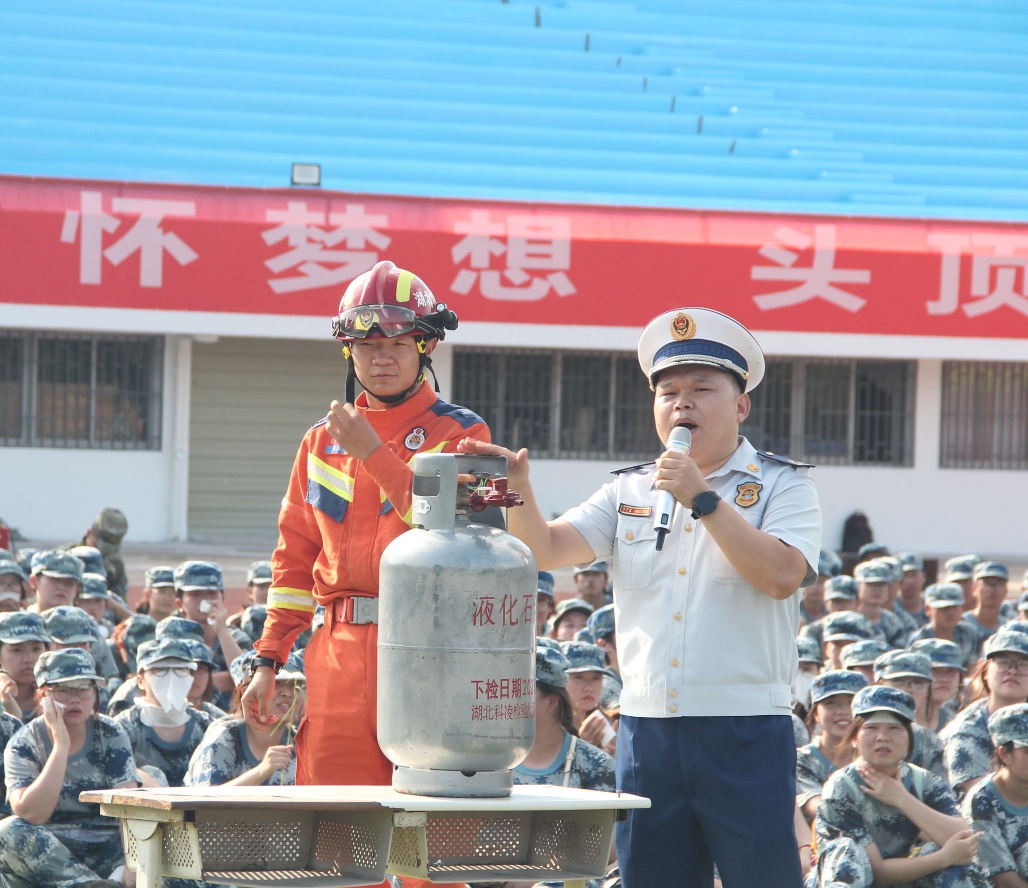 消防演练正式开始之前,消防员先为全体新生讲授消防安全知识及日常生活中的消防安全隐患,然后详细讲解了灭火器的分类和使用方法,并向大家演示了液化石油气罐着火时的正确处置方法。