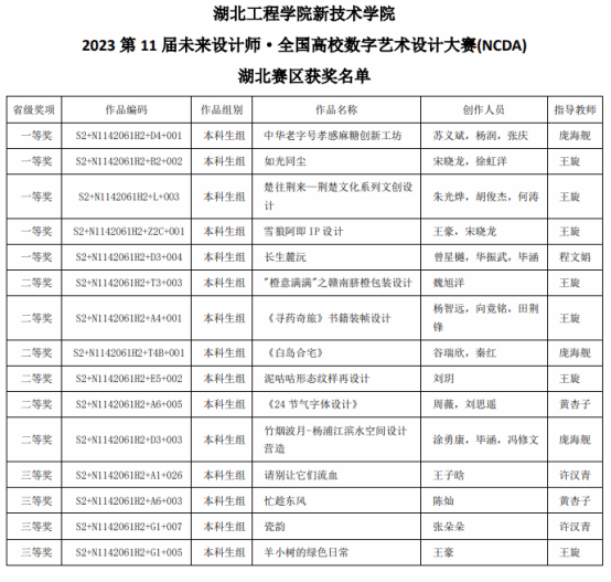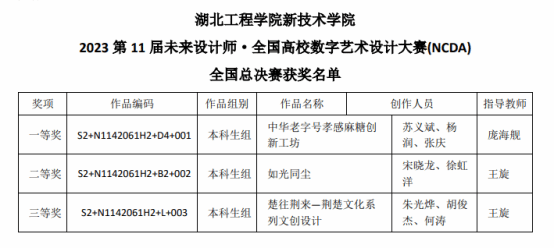 本网讯 在刚刚落下帷幕的第十一届未来设计师·全国高校数字艺术设计大赛上传来好消息,公司语言文学系学子取得了全国决赛等级奖3项、省级奖项15项的优秀成果。其中,由公司庞海舰老师指导,苏义斌、杨润、张庆同学的作品《中华老字号孝感麻糖创新工坊》斩获全国决赛一等奖;由王旋老师指导,宋晓龙、徐虹洋同学的作品《如光同尘》收获全国决赛二等奖,朱光烨、胡俊杰、何涛同学的作品《楚往荆来——荆楚文化系列文创设计》获得全国三等奖。