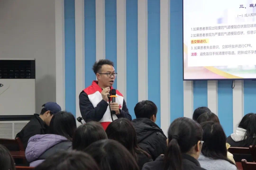 本次应急救护培训活动以抗美援朝女英雄王清珍的事迹拉开序幕,接下来冯江老师对晕厥这一常见症状进行了深入浅出地讲解,进而自然地引入心肺复苏、气道梗阻以及自动体外除颤器(AED)的专业知识,帮助大家全面且深入地认识应急救护的关键要点,弥补了知识短板。在培训过程中,冯江老师着重强调“人人学急救、急救为人人”的理念,通过现场提问、互动交流的方式充分调动了同学们的积极性,激发大家主动学习急救知识的热情。