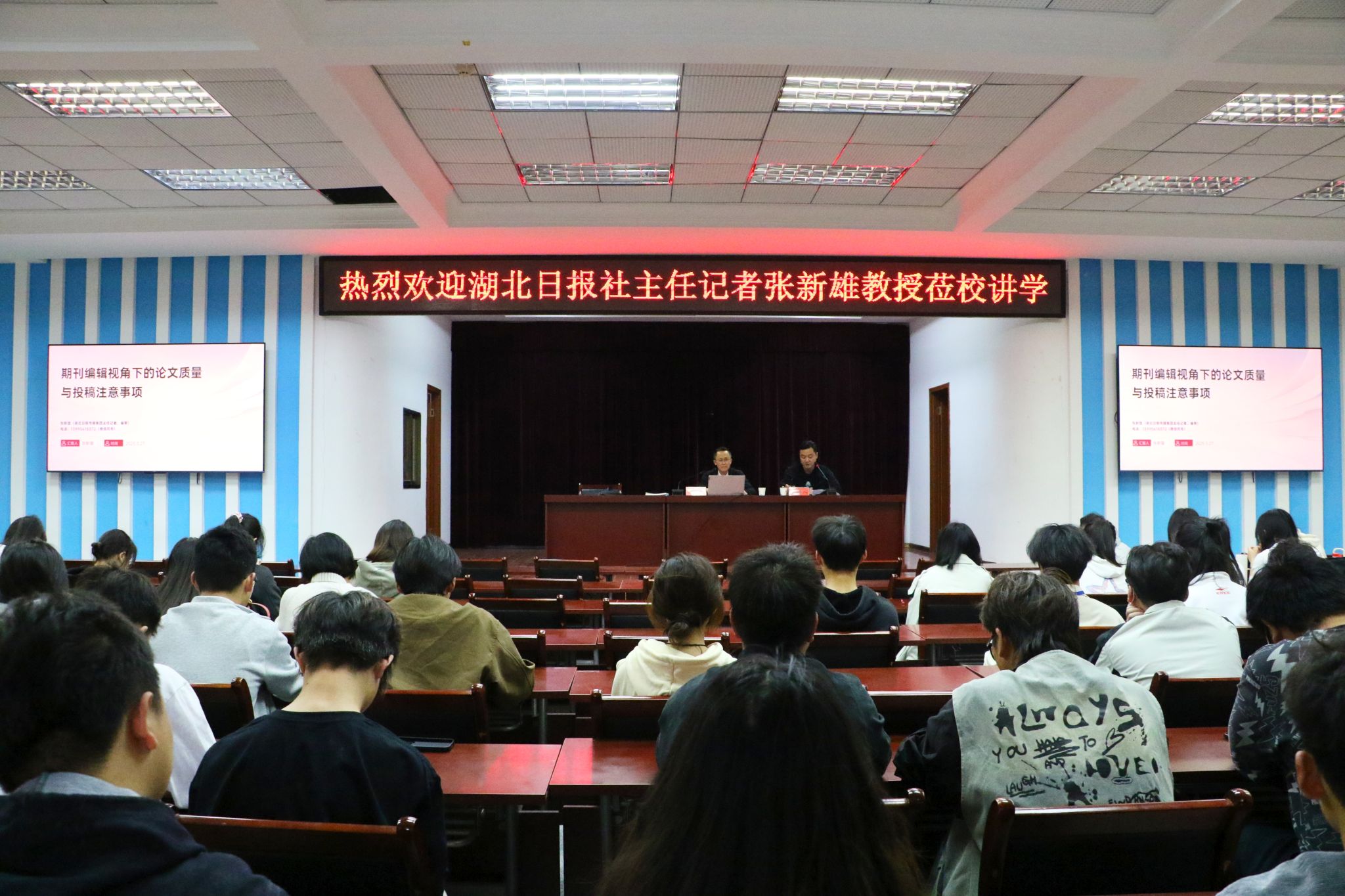 本网讯(员工记者 罗卿 见习员工记者 李兰 方妍)为提升学术论文质量,强化学术规范意识,3月27日下午,由党务工作部主办的“期刊编辑视角下的论文质量与投稿注意事项”专题报告会在科技楼五楼报告厅举行。湖北日报社主任记者张新雄教授应邀作主题报告,党务工作部部长潘志辉主持活动,各教学系师生代表参会。