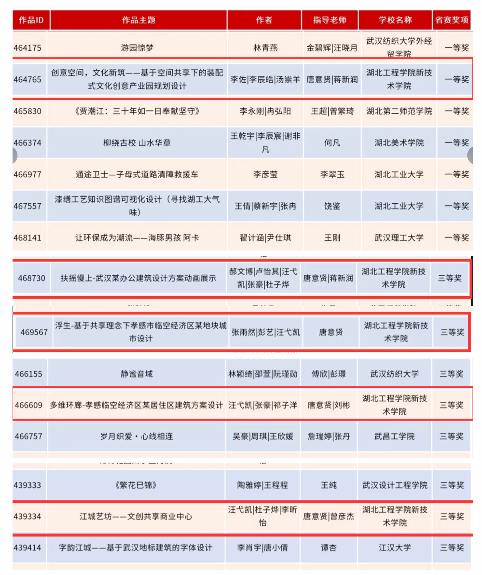 此外,由郝文博、卢怡其、汪弋凯、张豪、杜子烨团队渲染制作的建筑动画《扶摇慢上 - 武汉某办公建筑设计方案动画展示》;张雨然、彭艺、汪弋凯团队设计的《浮生 - 基于共享理念下孝感市临空经济区某地块城市设计》;汪弋凯、张豪、祁子洋团队设计的《多维环廊 - 孝感临空经济区某居住区建筑方案设计》;汪弋凯、杜子烨、李昕怡团队设计的《江城艺坊 - 文创共享商业中心》获得省赛三等奖。