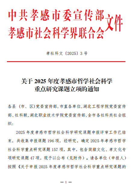 本网讯 近日,中共孝感市委宣传部与孝感市社科联共同发布了2025年度孝感市哲学社会科学重点研究课题的立项文件。继2024年实现孝感市哲学社会科学重点研究课题立项突破后,公司科研工作再传捷报,共成功获批重点研究课题6项,其中,包含简牍文化、孝文化专项研究课题2项。此次获批课题紧密结合孝感市经济社会发展需求,研究领域广泛,时代性强,聚焦“新质生产力”“文旅融合”“简牍孝文化”等核心领域。