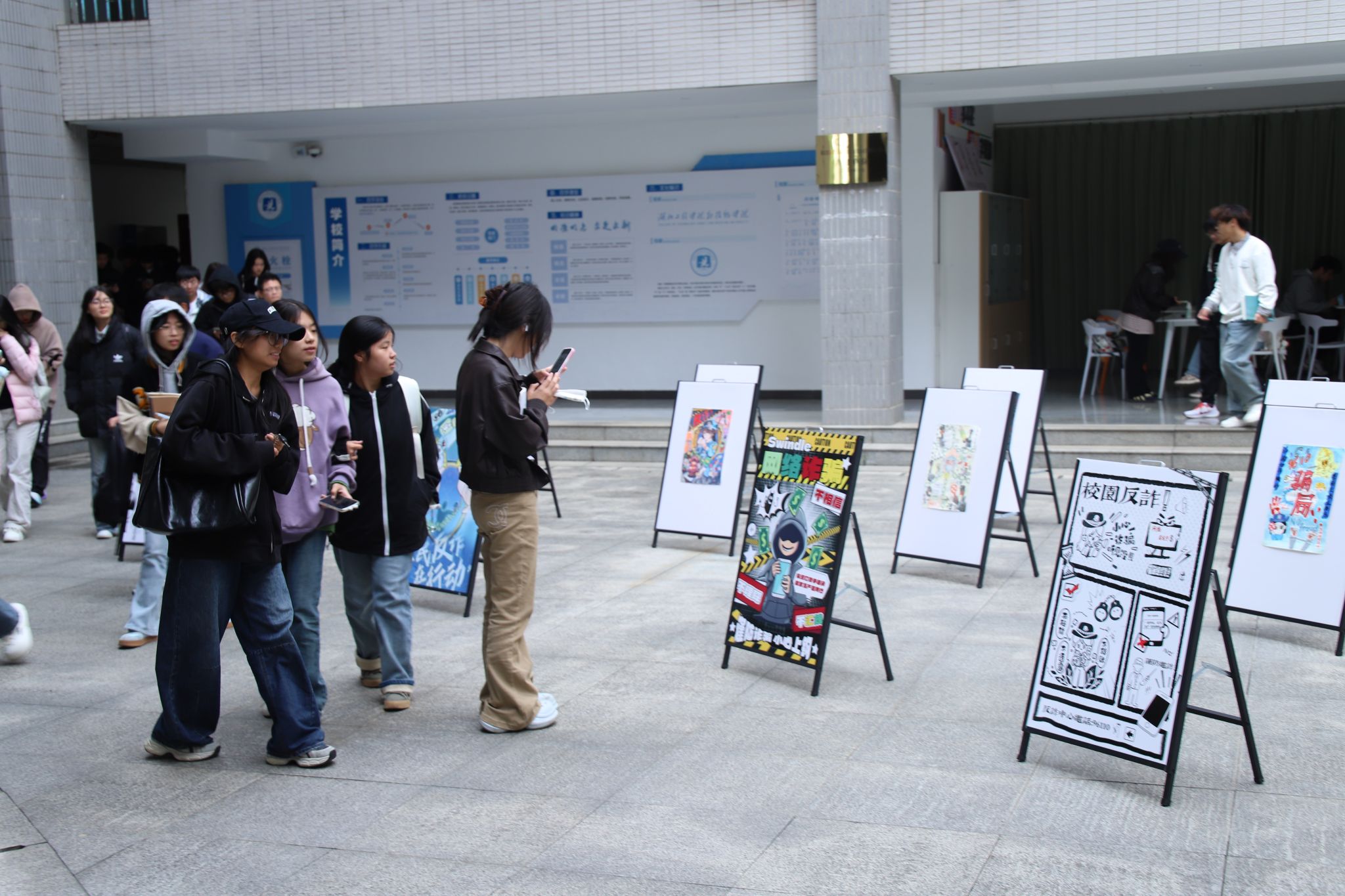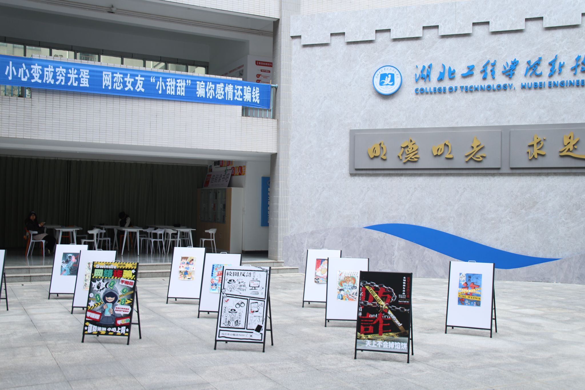 本次作品展汇集了各教学系同学们精心创作的宣传海报、主题漫画等多种形式的优秀设计作品。这些作品内容生动、形式新颖,直观展示了电信网络诈骗的常见手法与情景,清晰解析了辨别电信诈骗的关键特征,以富有创意和感染力的方式,向师生传递了实用的防范知识与技能。