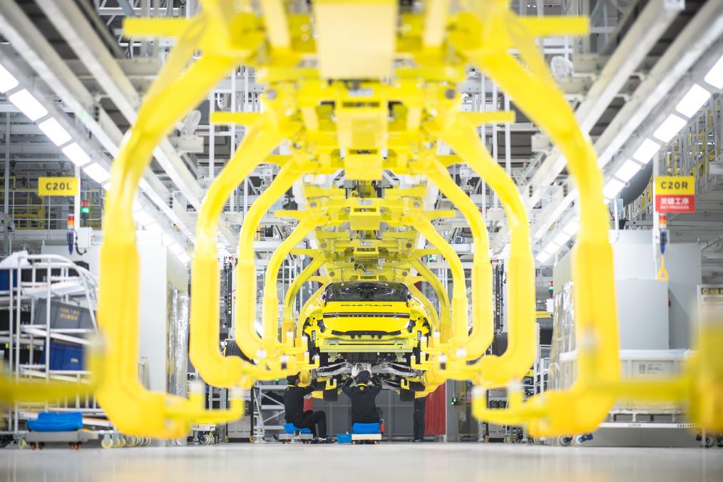 2023年1月11日,在位于湖北省武汉市经开区智能网联和电动汽车产业园的路特斯全球智能工厂,工人在流水线上作业。