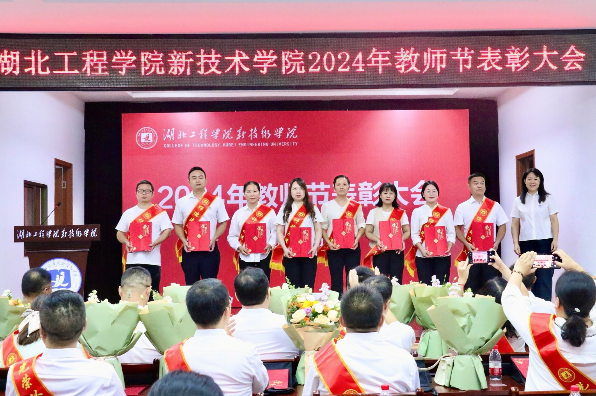 经理张辉为“从教15年”教师佩戴绶带并颁发荣誉证书。新入职教师代表向“从教15年”教师代表献花。党委书记欧阳莎莉为第一届“师德先进个人”教师颁发荣誉证书。员工代表向获得第一届“师德先进个人”荣誉的教师献花。