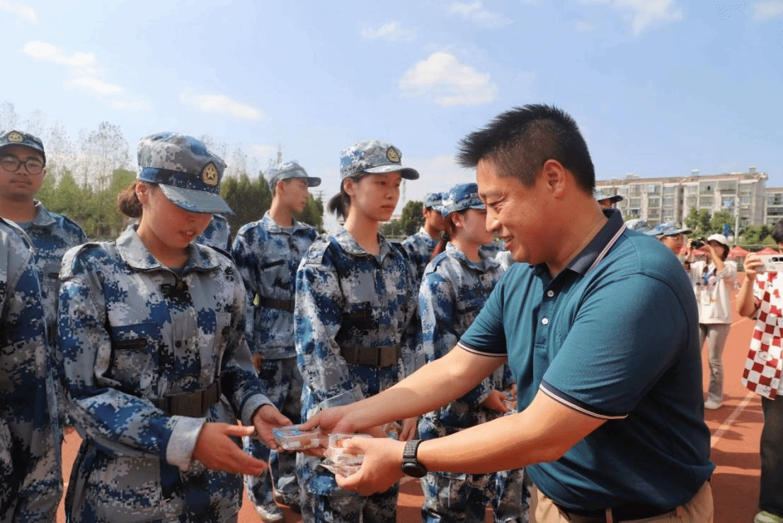 校领导满怀喜悦地将这份载满情谊的月饼逐一送到教官和新生手中,祝他们节日快乐,并提醒大家在军训中要注意防暑降温、劳逸结合,以更加饱满的精神状态圆满完成军训任务。