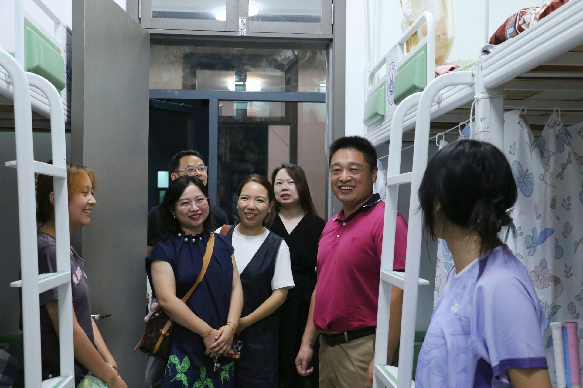 本网讯 迎新工作圆满结束,9月8日晚,经理张辉带领办公室主任、语言文学系主要负责人以及辅导员和新生班主任走访2024级新生寝室。