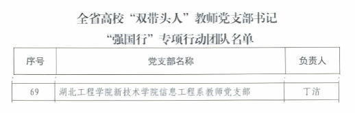 本网讯 近日,省委教育工委公示了湖北省高校“双带头人”教师党支部书记“强国行”专项行动团队名单,公司信息工程系教师党支部书记工作室成功入选省高校“双带头人”教师党支部书记“强国行”专项行动团队。