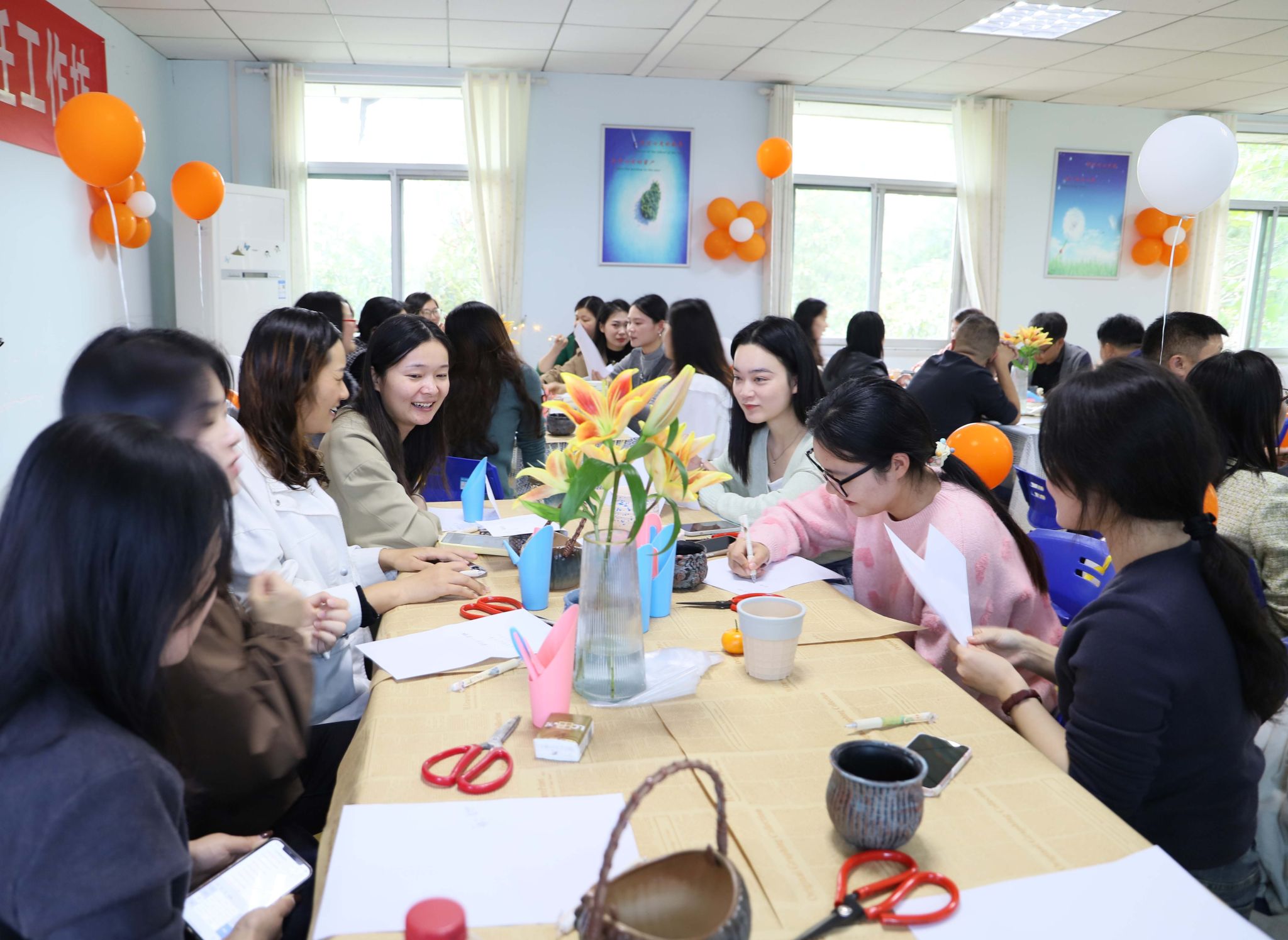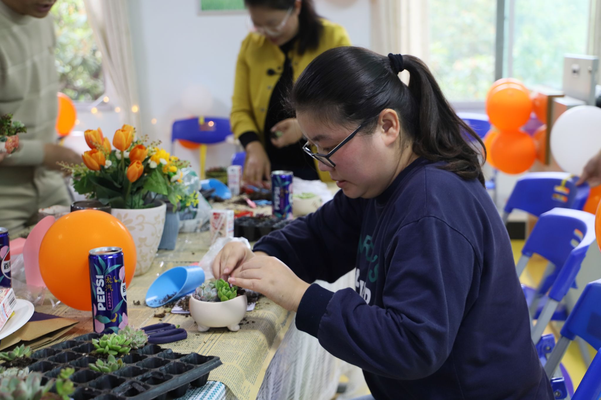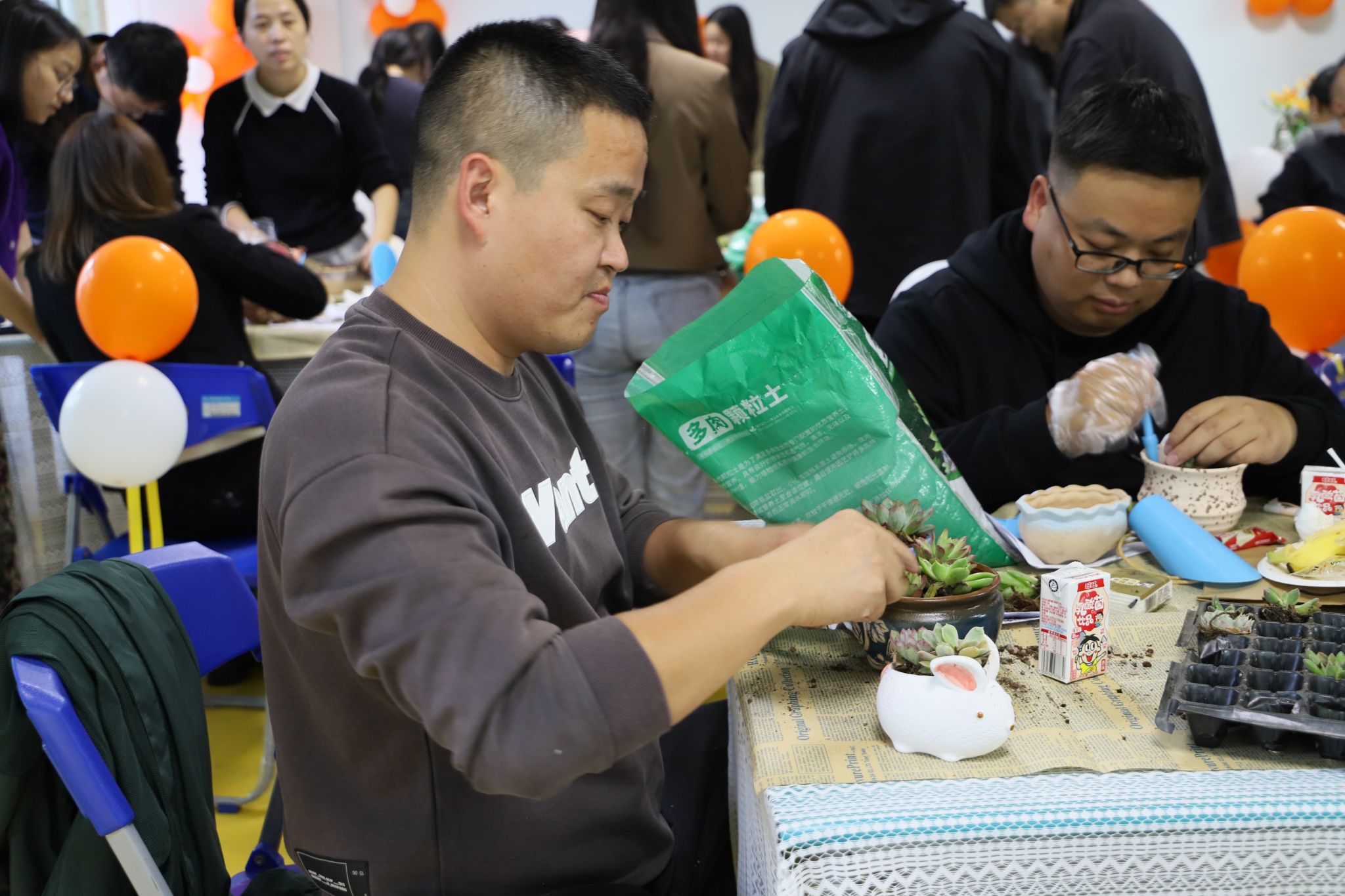 随后进行的绿植栽培环节,班主任老师们在专业指导老师的带领下,认真学习了绿植的种植技巧,相互交流种植经验与心得,分享各自对不同绿植养护的独到见解。现场充满了愉悦和温馨的气氛。