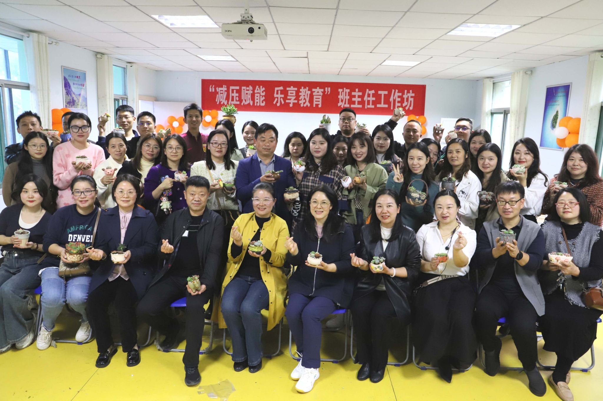 此次班主任减压赋能工作坊活动包括“班主任的压力管理与自我调节”团体心理辅导和绿植种植两个环节。活动开始,郑教授首先给大家深入解析了压力的根源及应对策略,并为班主任们提供了宝贵的建议,通过热身小游戏、小组互助、放飞纸飞机(压力)、音乐放松等方式,在轻松愉快的氛围中引导老师们逐步释放了累积的压力。老师们将自己生活中的欢乐与困扰写在纸上,折叠成纸飞机,轻轻地投出去,日常生活中的忙碌与烦恼也被暂时抛开,大家都享受着心灵的慰藉与滋养。