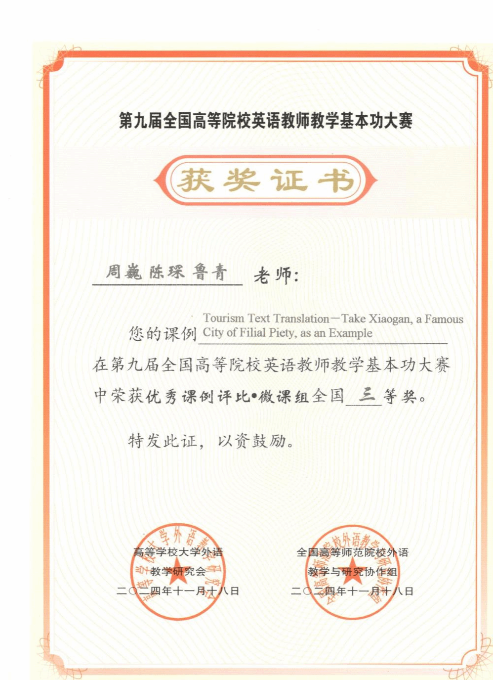 在本次大赛微课组赛道中,来自全国各大高校的260多位英语教师进行了微课作品比拼。周巍、陈琛、鲁青团队的《Tourism Text Translation - Take Xiaogan, a famous city of filial piety,as an Example》课程微课作品“旅游文本翻译——以孝文化名城孝感为例”,以精巧的教学构思、丰富的教学内容、扎实的教学功底从众多作品中脱颖而出,获得全国“三等奖”。