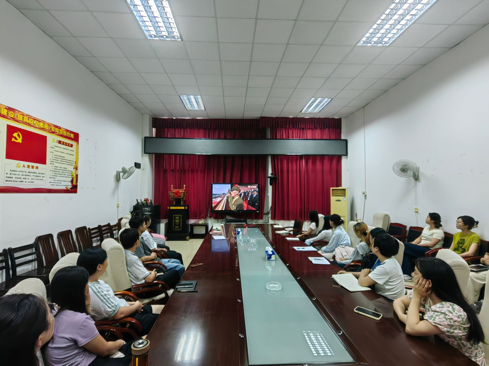 机关全体人员在科技楼多功能厅收看直播