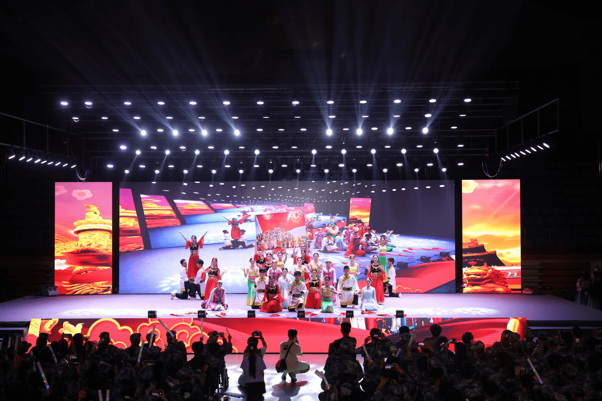 各院系师生及教官团队先后呈现了《像你这样的朋友》《梦回红楼》《旗开得胜》《民族团结一家亲》《智启未来》《敦煌乐鼓》等精彩节目。辅导员团队的朗诵《致新程》温情寄语新生,教官歌舞《改变自己》拉近与员工的距离,全体合唱《歌唱祖国》将现场气氛推向高潮。
