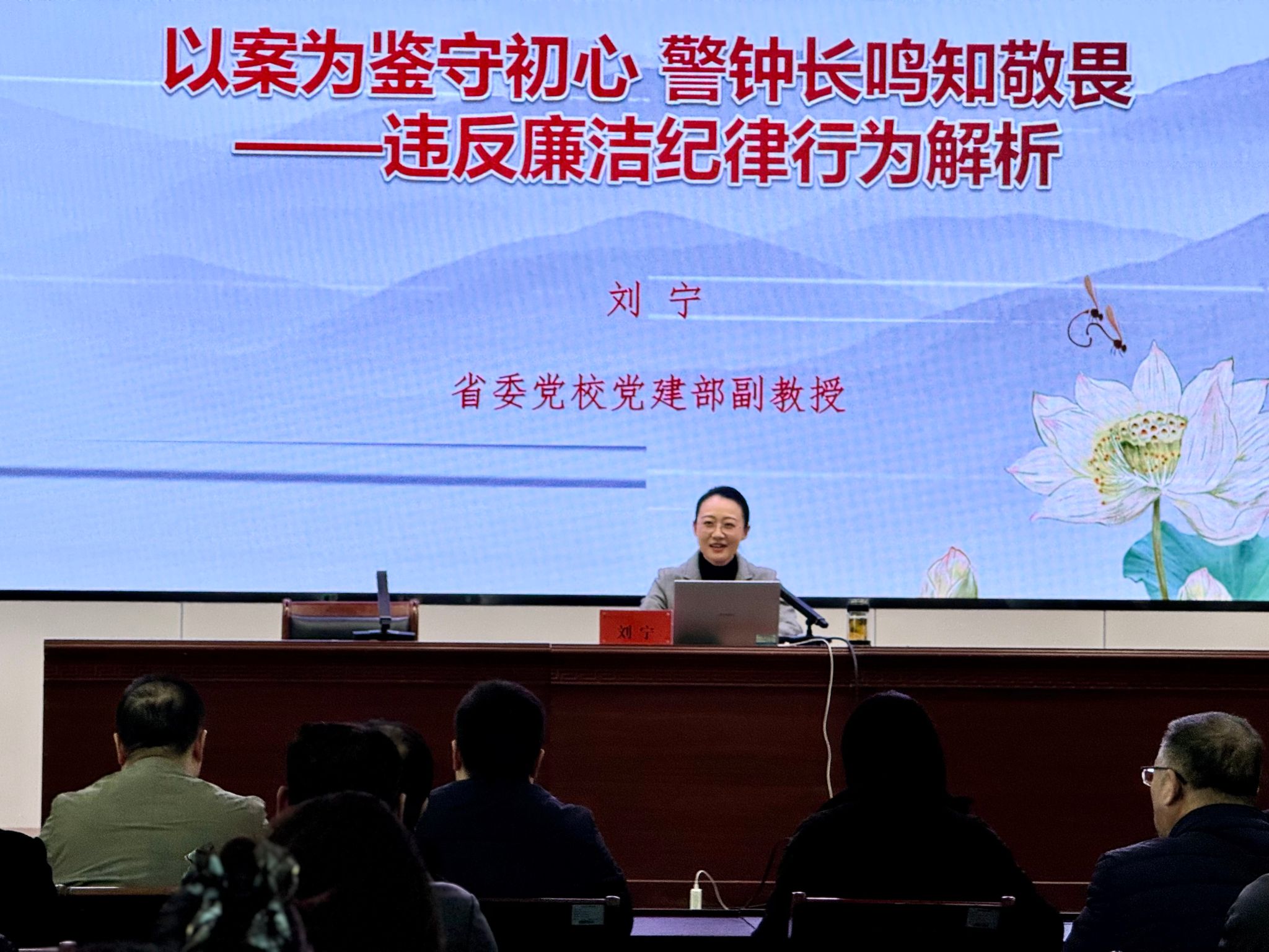 中共湖北省委党校(湖北省行政公司)党史党建教研部副教授刘宁作了题为《以案为鉴守初心 警钟长鸣知敬畏——违反廉洁纪律行为解析》的专题报告。她结合《中国共产党纪律处分条例》第八章对违反廉洁纪律行为的处分展开讲解,围绕“深刻认识廉洁纪律的重要性”“违反廉洁纪律的突出表现”“坚守廉洁底线的实践要求”等三个方面进行了系统阐述。