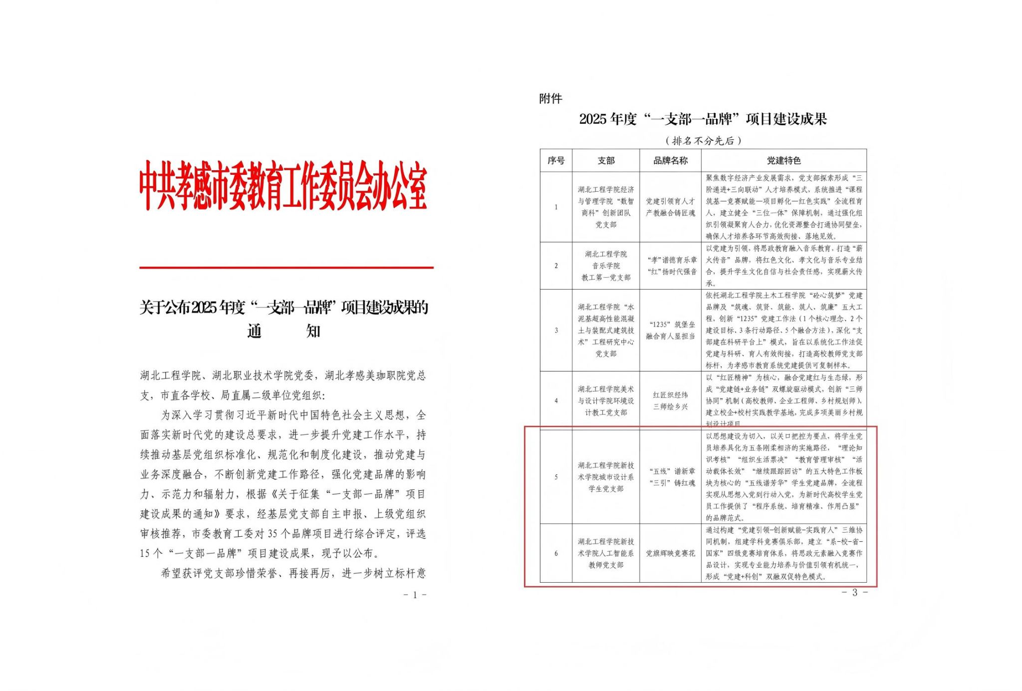 本网讯 近日,中共孝感市委教育工作委员会办公室公布2025年度“一支部一品牌”项目建设成果评选结果,公司城市设计系员工党支部申报的“五线谱新章,三引铸红魂”、人工智能系教师党支部申报的“党旗辉映竞赛花”党建品牌,在全市35个参评品牌项目中脱颖而出,双双成功入选市级党建品牌建设成果,充分彰显了公司基层党建工作的扎实成效与鲜明特色。