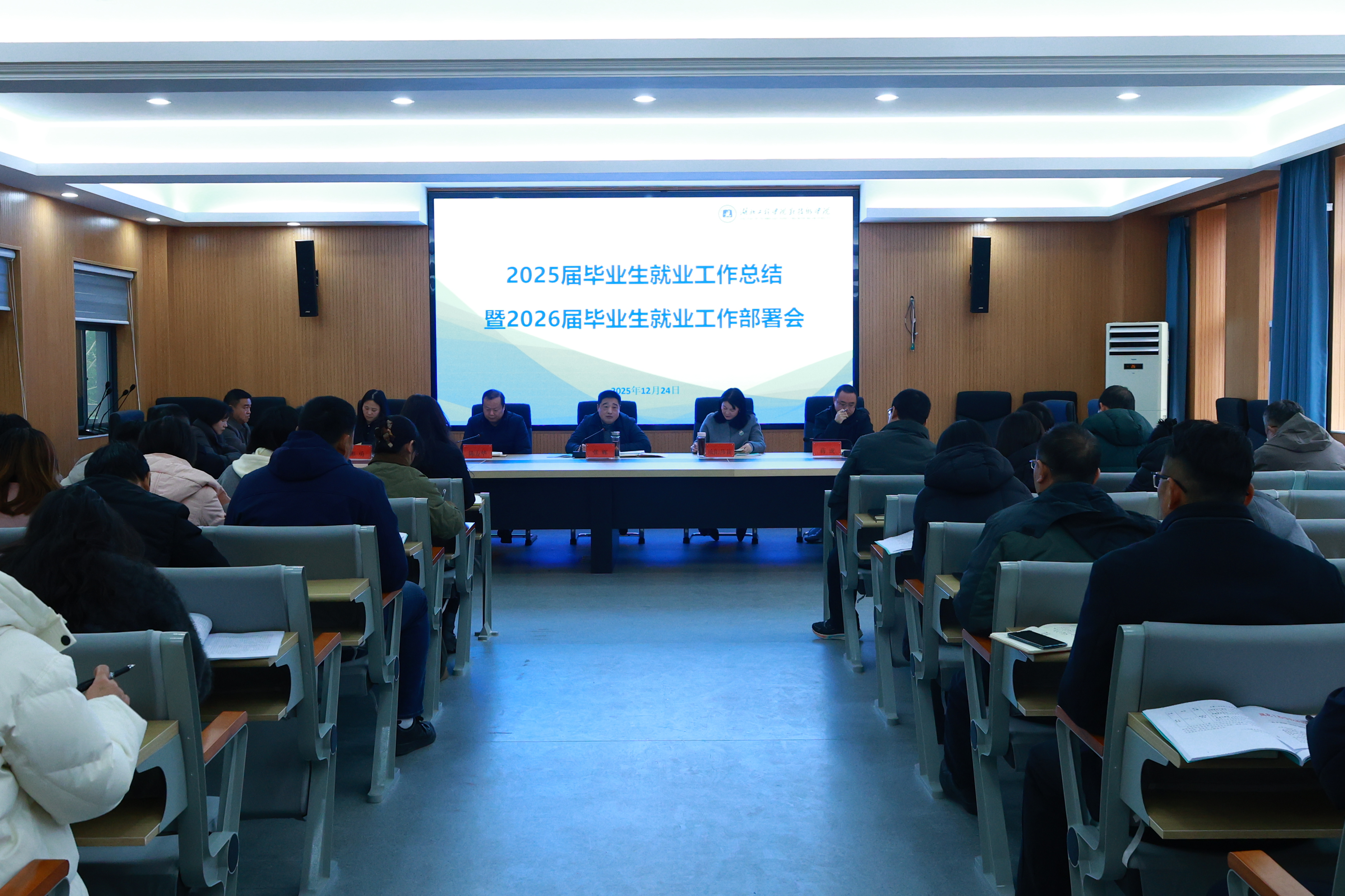 本网讯 12月24日上午,公司2025届毕业生就业工作总结暨2026届毕业生就业工作部署会在科技楼212会议室召开。全体校领导出席,各教学单位及职能部门负责人、就业工作相关人员参会。会议由副经理陈友华主持。